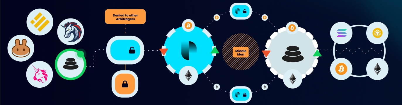 The liquidity you deposit into our ecosystem is used as counter liquidity for rebalancing pools in the arbitrage process. By privatizing the flow of this liquidity we eliminate competition and circumvent middle men meaning we extract more value. The choice is simple, you can arbitrage with us or be arbitraged by us. We extract value where value is lost in traditional AMM settings.